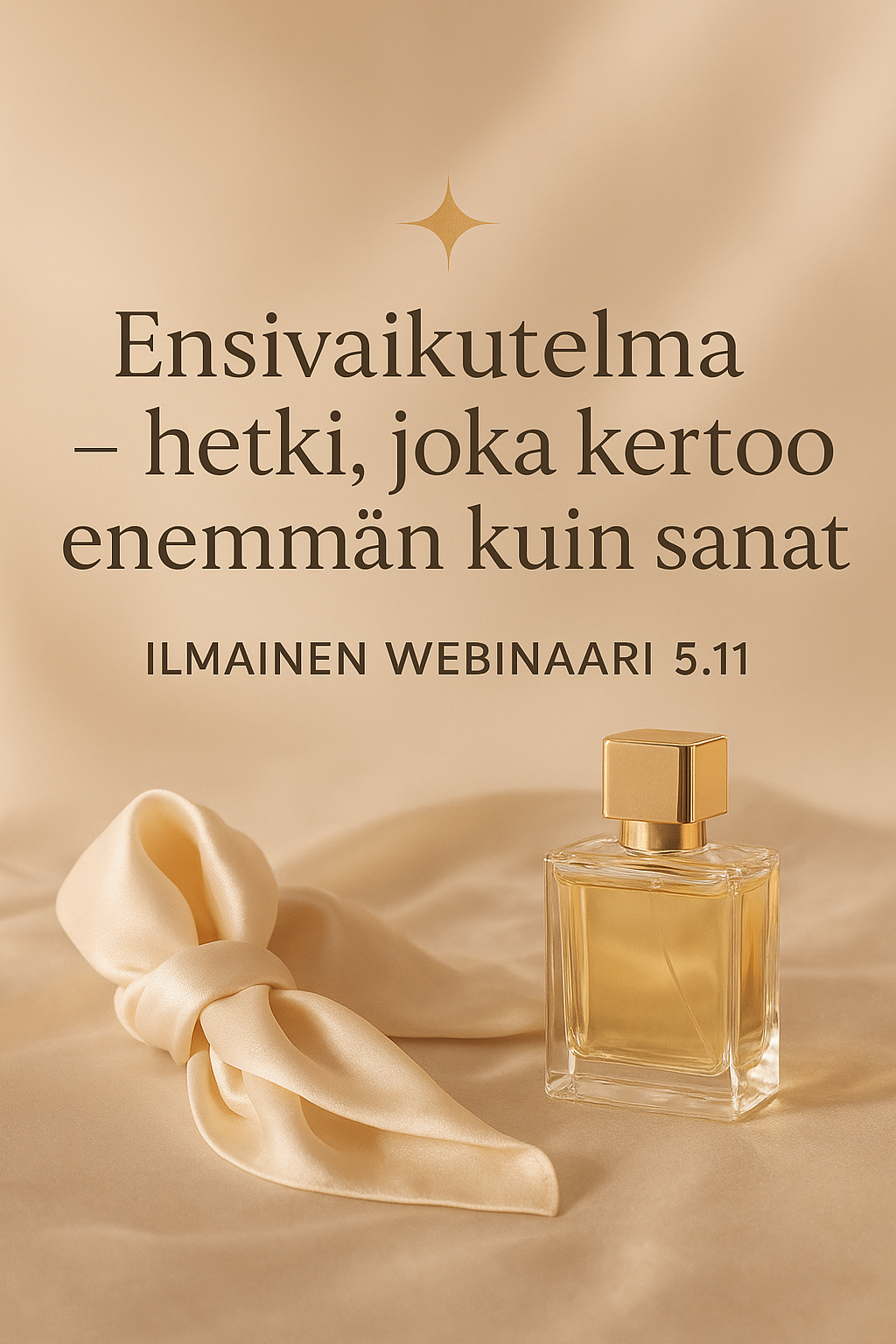 Voit tehdä ensivaikutelman vain kerran – mutta sen voi kestää pitkään. Tule mukaan puolen tunnin webinaariin, jossa sukellamme hetken kauneuden maailmaan: mitä ensivaikutelma todella on, mitkä tekijät sen määrittävät ja miten voit onnistua siinä helposti ja aidosti.